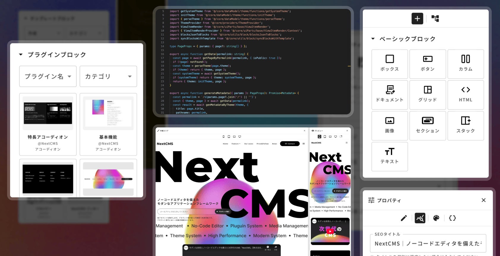 NextCMSはデザインエディタを備えたWebサイト構築フレームワークです。直感的なデザインエディタでウェブページを作成できるだけでなく、スクラッチ開発で顧客管理や決済、チャットなどのシステム開発の統合が可能です。