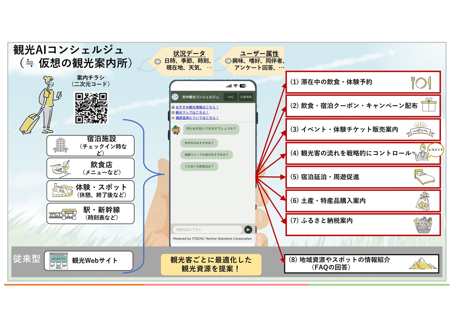 伊藤忠テクノソリューションズ株式会社(代表取締役社長:新宮 達史、本社:東京都港区、略称:CTC)と一般社団法人 安中市観光機構(理事長:武井 宏、所在地:群馬県安中市、以下;安中市DMO※1)は、一般社団法人 関東広域観光機構(代表理事:田川 博己、所在地:神奈川県横浜市、以下:関東広域DMO)とともに連携して、生成AIを活用した次世代観光案内サービス「観光AIコンシェルジュ」を開発し、1月よりサービス提供を開始しました。多言語かつ24時間対応で、旅行者一人ひとりに最適な提案を行い、安中市の地域観光の課題解決と消費拡大を支援します。