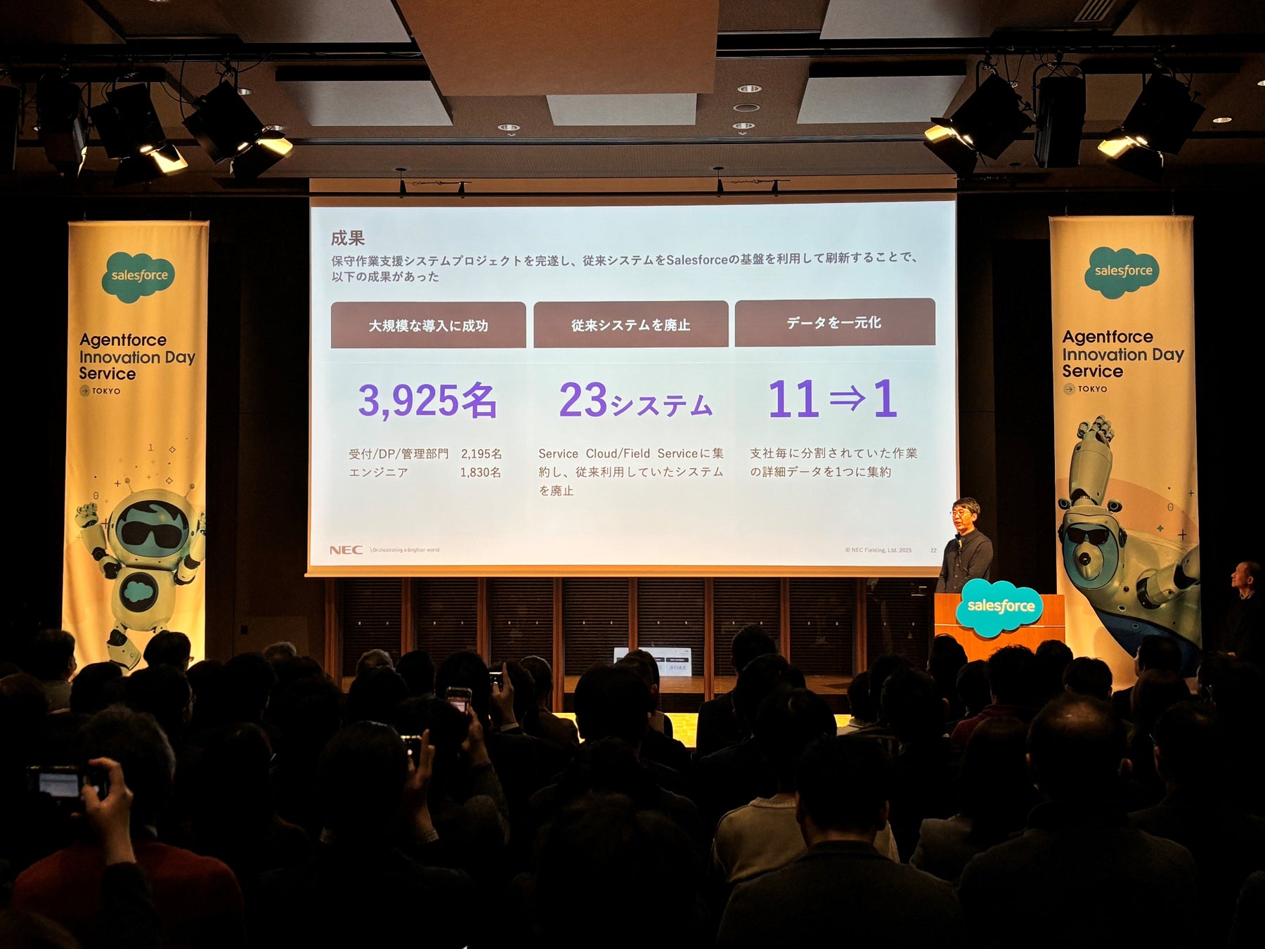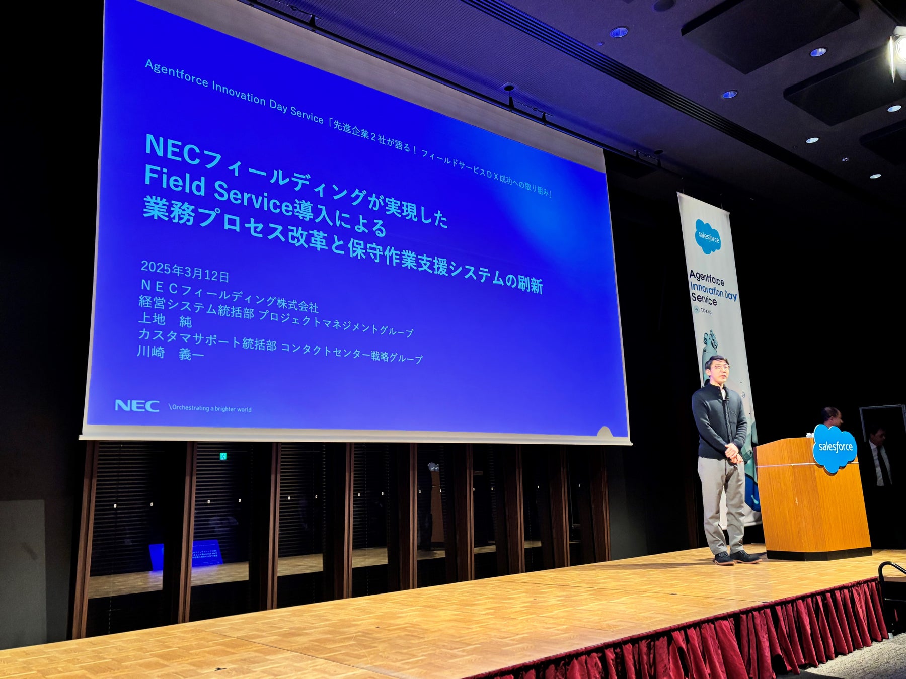 NECフィールディングは、2025年3月12日(水)に開催されたSalesforce主催イベント「Agentforce Innovation Day Service」に登壇し、本プロジェクトの背景や成果を紹介しました。長年使い続けてきた保守支援システムを刷新した本取り組みに、非常に多くの関心が寄せられました。