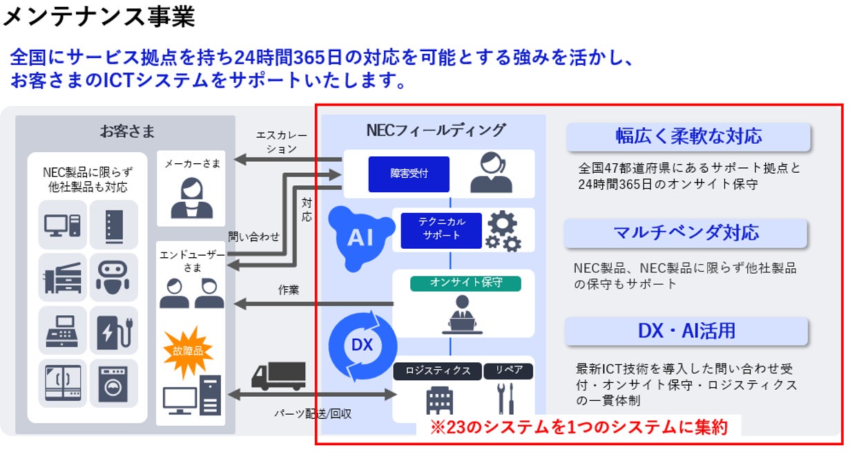 NECフィールディングは、保守支援システム「CS-Force」の構築により、お客様システムの保守運用だけでなく、システムの安定稼働と課題解決に貢献していきます。今後も、全国の保守拠点網を活用した24時間365日対応可能な保守体制により、お客様をトータルにサポートしていきます。