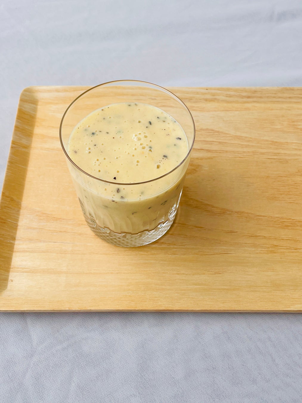 材料を全て合わせてハンディーブレンダーでミックスする。フルーツは同じ分量だけパイナップルやマンゴーに代用しても可。