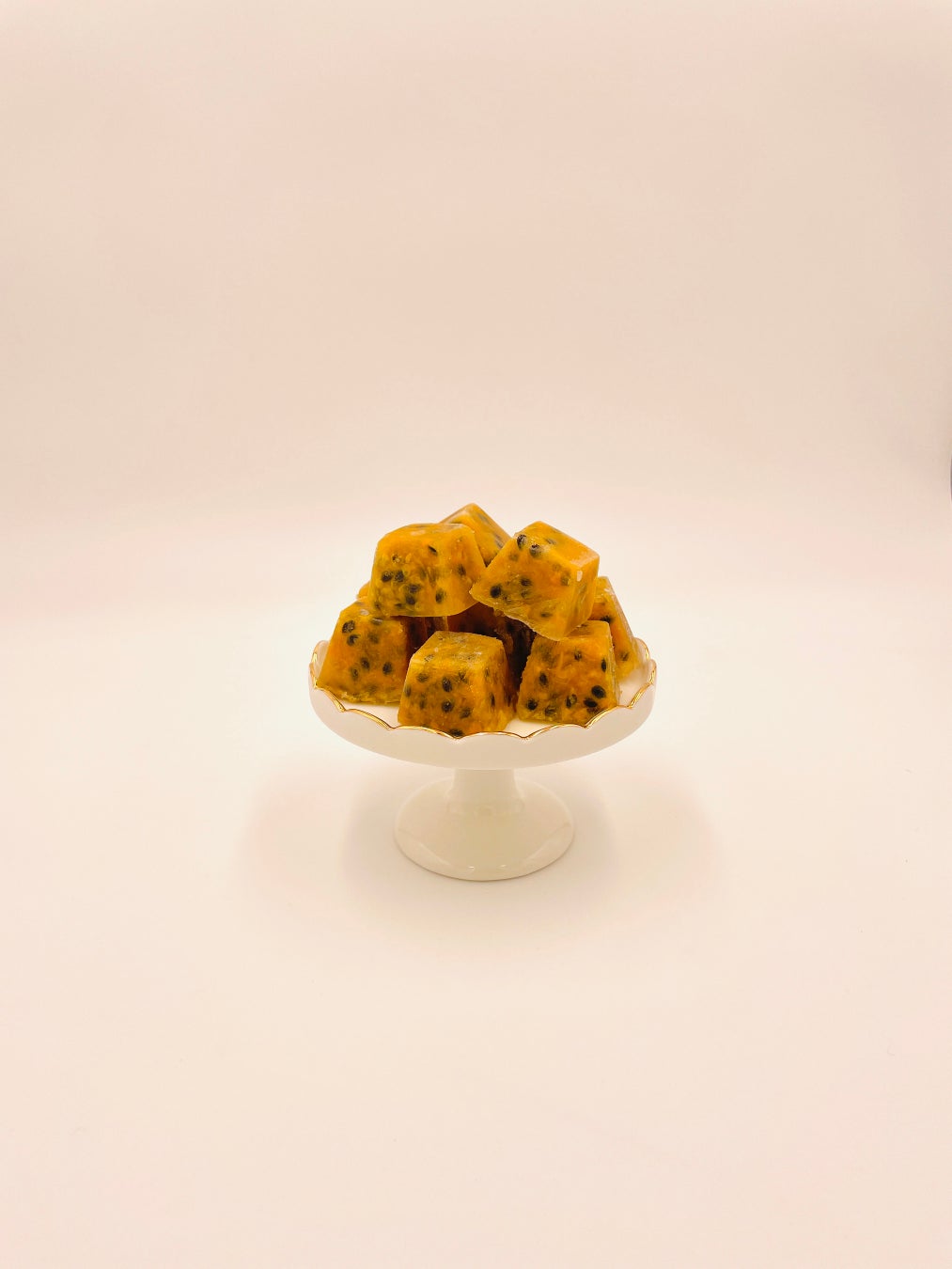こうして一年かけて完熟したパッションフルーツは、新鮮なうちに凍結加工し、ひとくちサイズのキューブに。