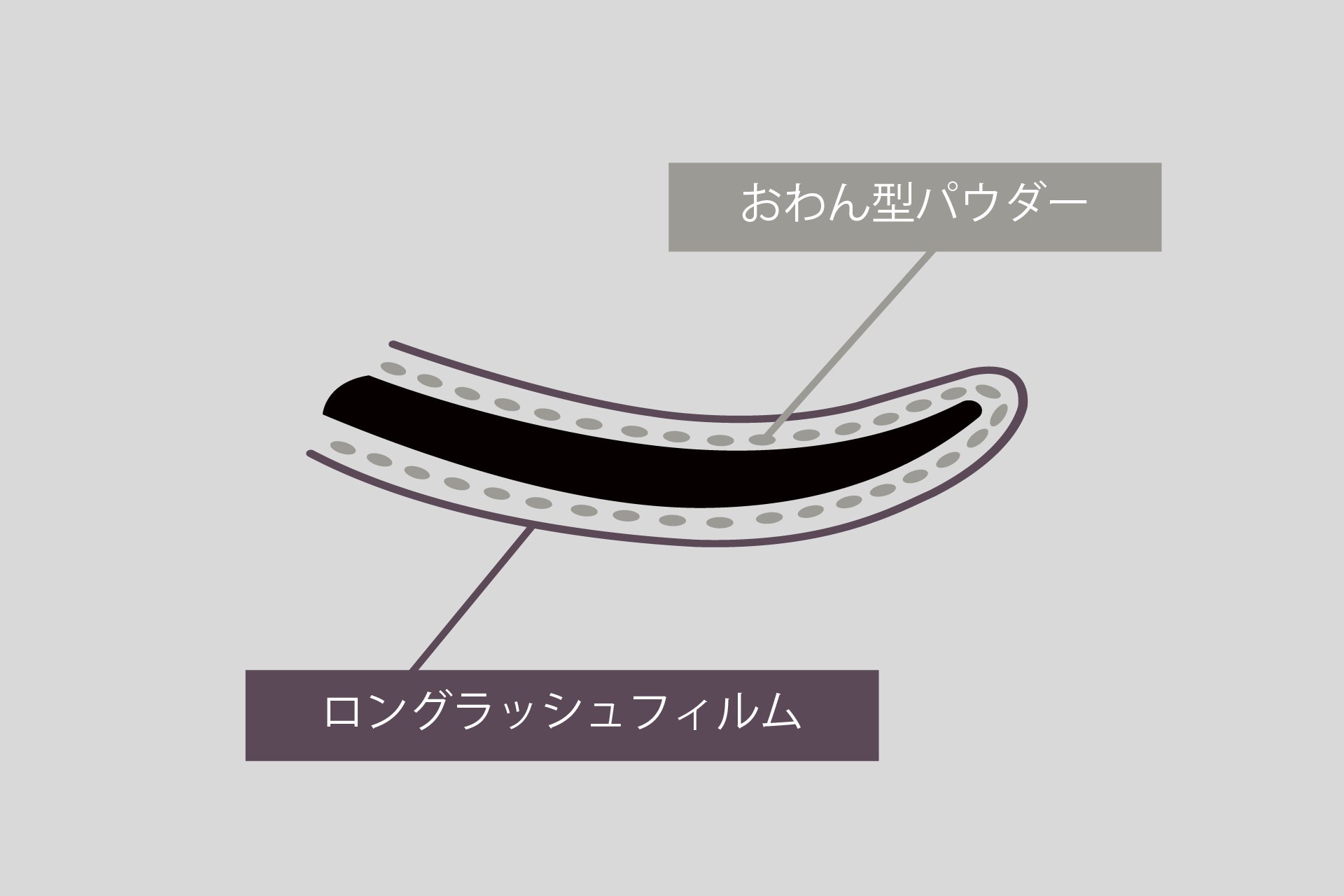 おわん型パウダーとロングラッシュフィルムコーティング処方。