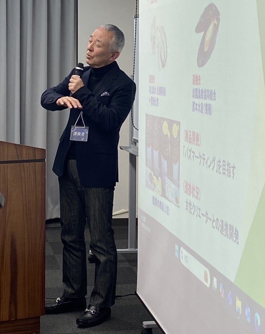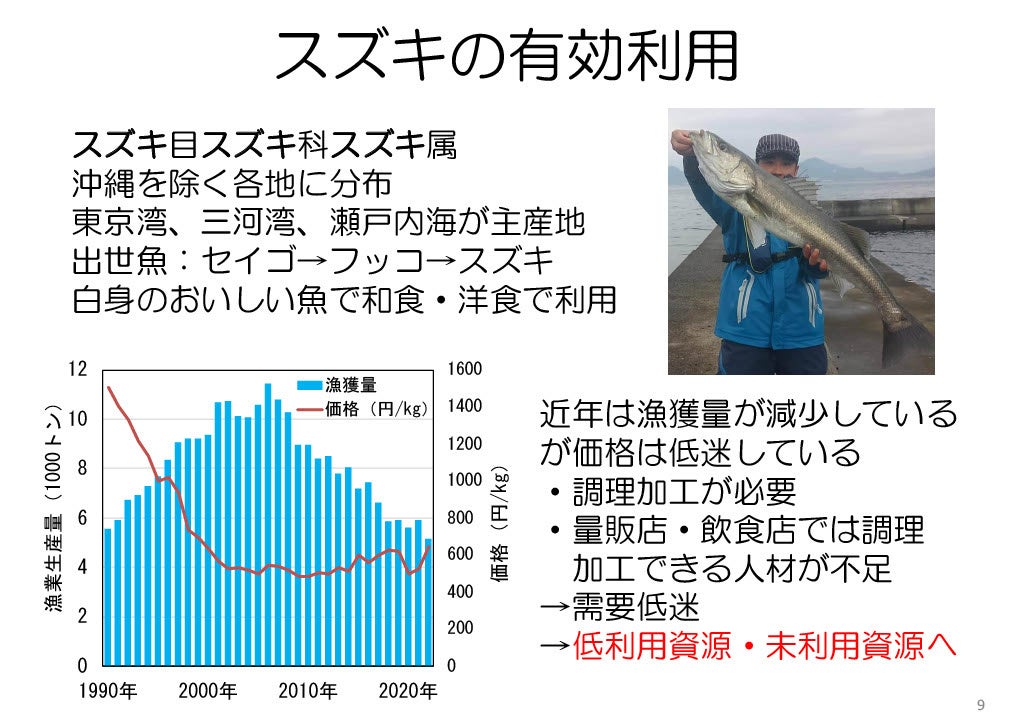 また、未利用・低利用資源の有効利用には【新しい価値の創造】【新しい生産システムの構築】が必要であること、さらに、新しい生産システムの構築には生産者・加工業者・販売業者が連携して取り組むことが必要で、新しい価値の創造には、その魚の特徴や成分、効能等の科学的裏付けや今後の資源状況の知見等が必要であり、これらに対応できる行政や研究機関との連携も重要になると話しました。