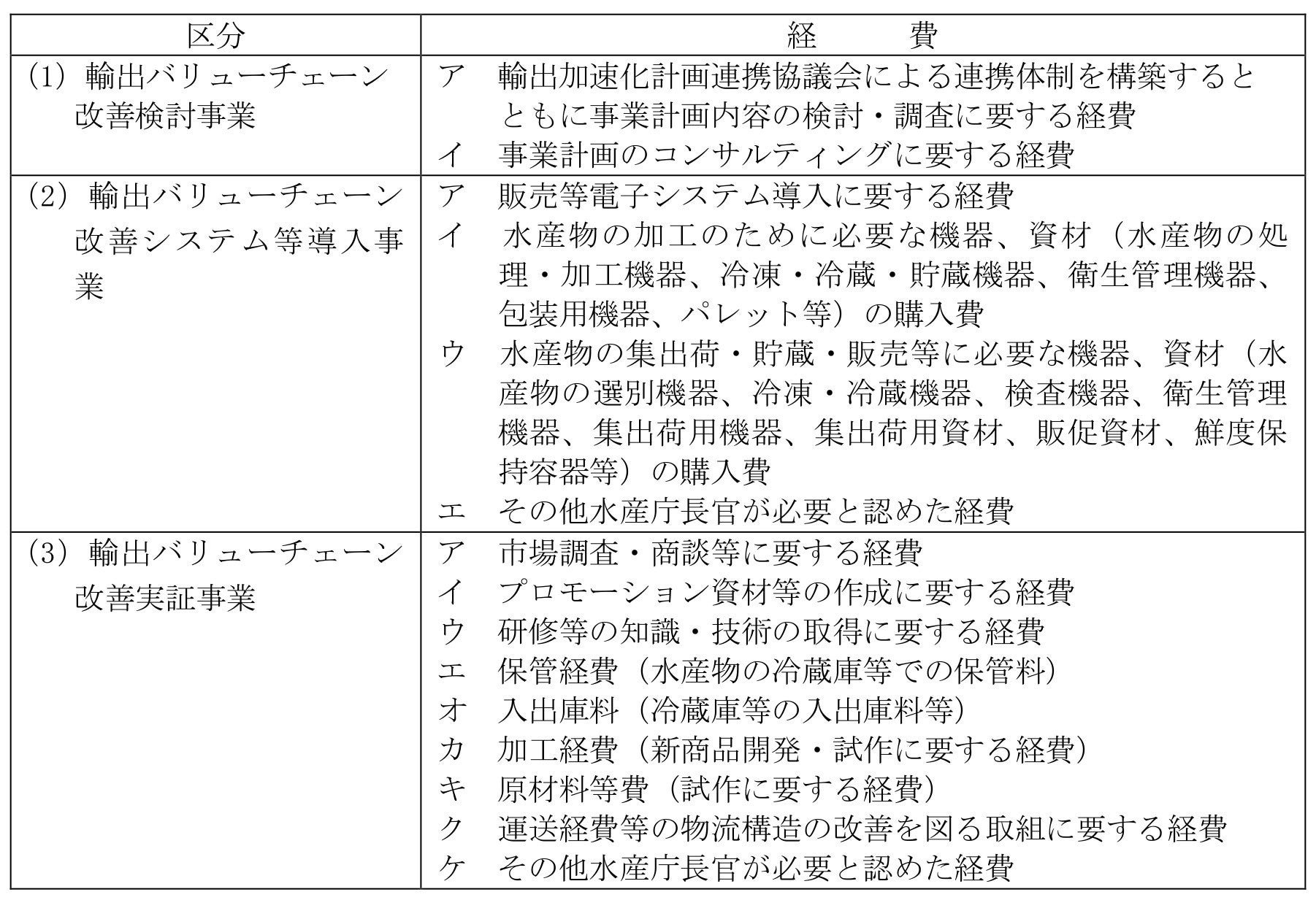 水産物の更なる輸出拡大の加速化に向けて、生産・加工・流通・輸出等のバリューチェーン関係者が連携して重点課題の解決に資する商流・物流構築の実証の取組を支援。
