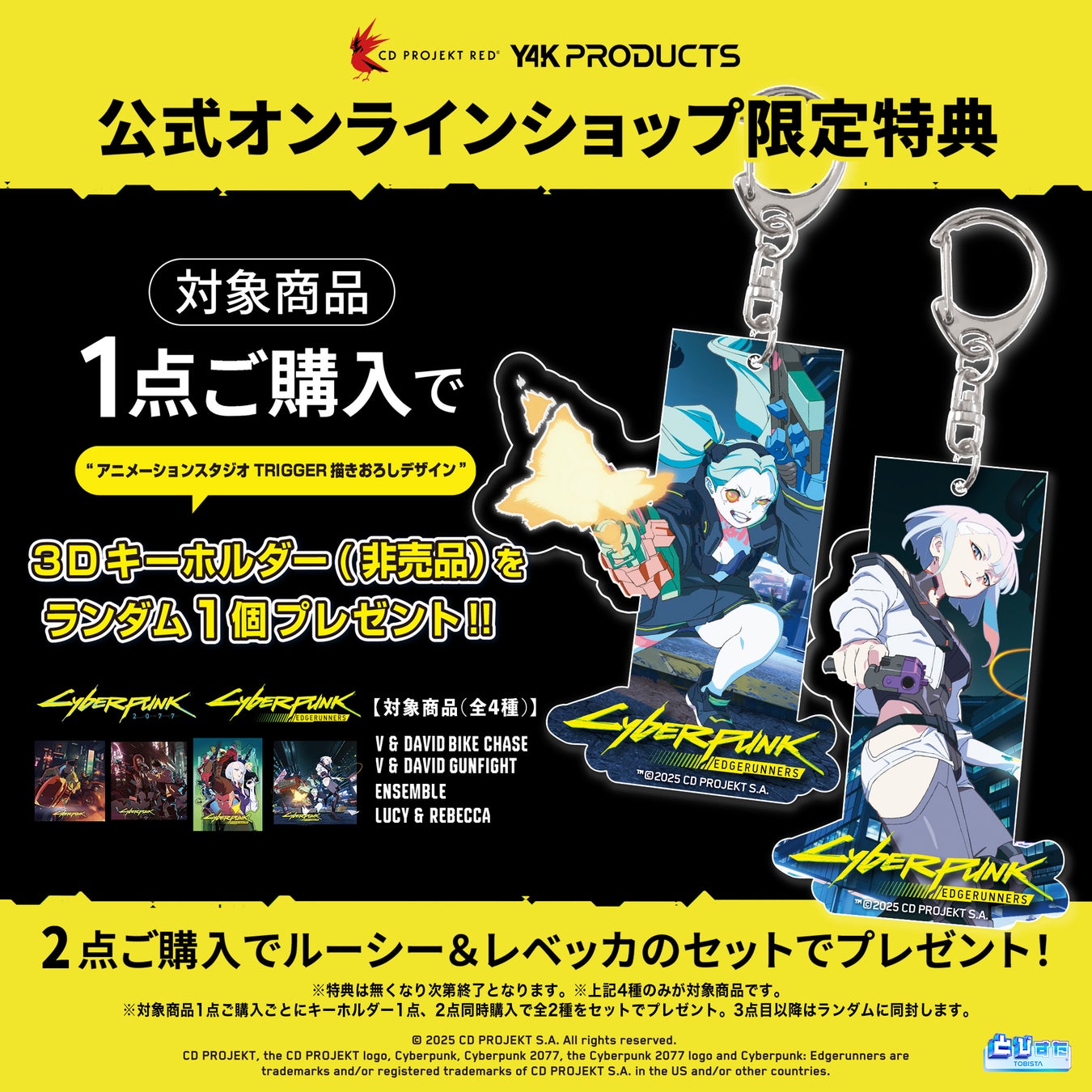 キャラクターグッズブランド「Y4K PRODUCTS」(販売元:株式会社YSC)から、特許出願中の次世代3Dキャラクタースタンド『とびすた®』シリーズと『サイバーパンク2077』『サイバーパンク: エッジランナーズ』(CD PROJEKT RED)のコラボアイテムが予約開始となりました。