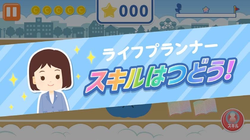 好きなプレイヤーとライフプランナーを選択します。プレイヤーは将来に続く人生を歩んでいく「みらいランナー」。ライフプランナーは選んだキャラクターにより「コレクト」「バリア」それぞれのスキルを発動することで、人生の伴走者としてプレイヤーを見守り助けます。
