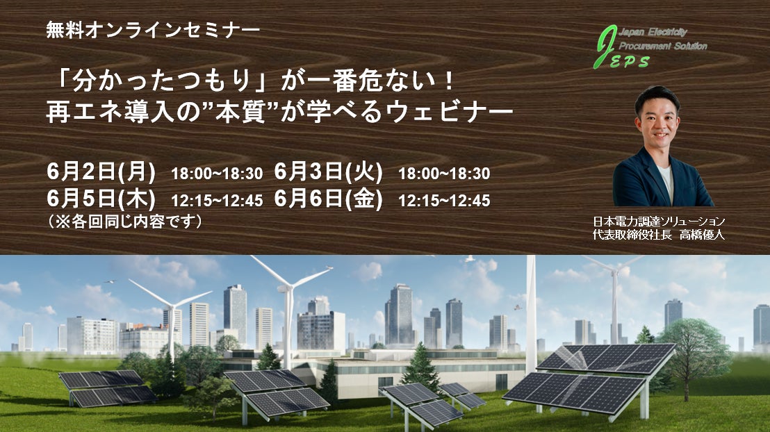 株式会社日本電力調達ソリューション(本社:東京都港区、代表取締役社長:高橋 優人)は、「分かったつもり」が一番危ない!再エネ導入の”本質”が学べるウェビナーを6月2日(月)、3日(火)、5日(木)、6日(金)に開催します。