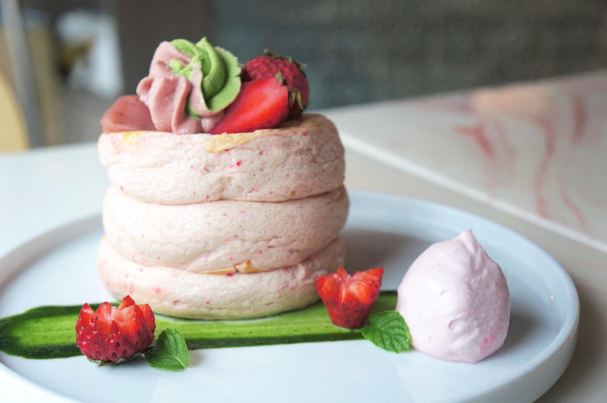 桜パウダーを練りこんだふわふわ食感のパンケーキに桜餡をのせ、抹茶とベリーのクリームが可愛らしく絶妙にマッチ。さらに、添えられたいちごの飾り切りがお花のように華やかさを演出します。プレートには別添えでベリーシャンティと抹茶ソースがあり、酸味と苦味の変化を味わえます。春の訪れを感じさせる、華やかで贅沢なパンケーキです。