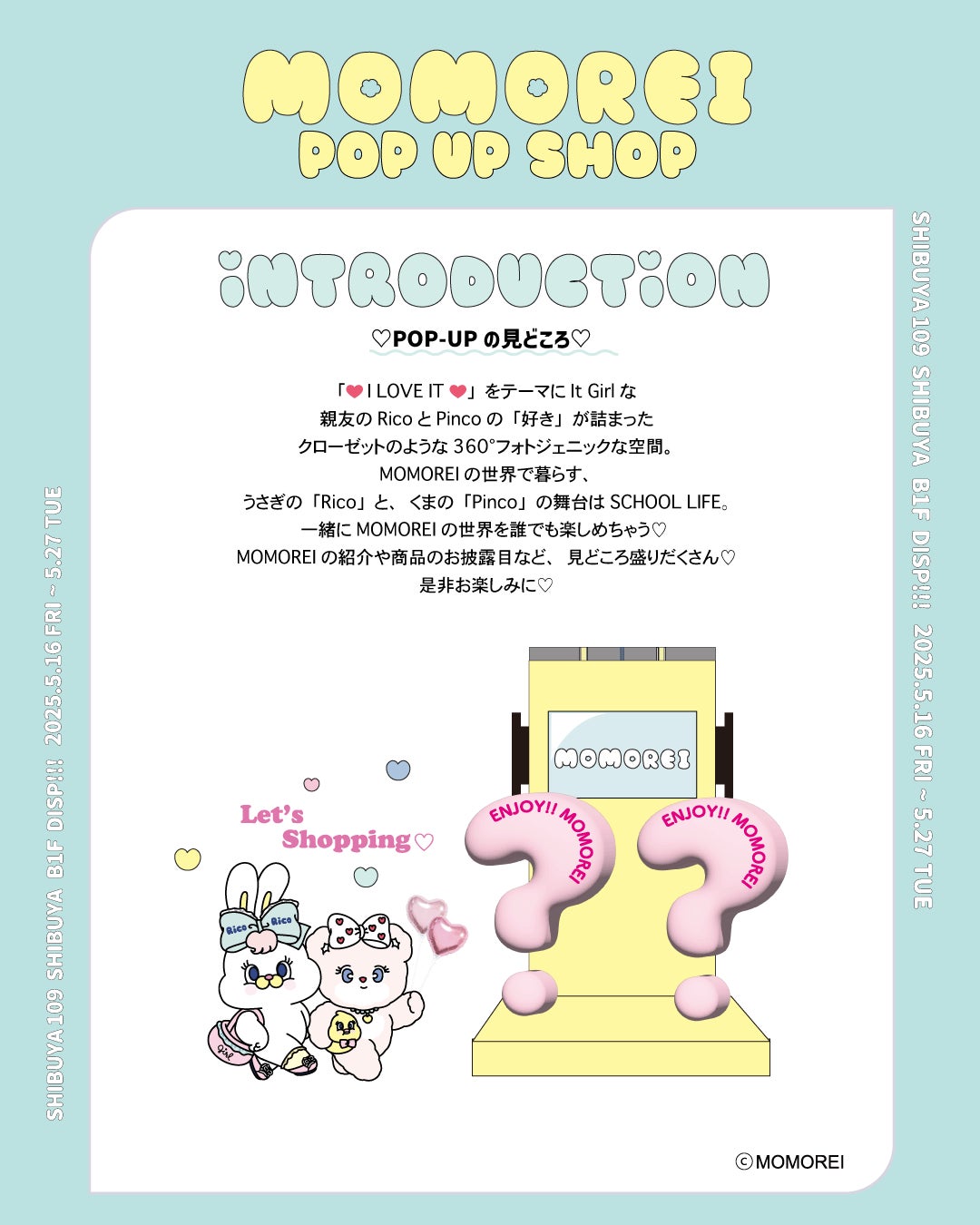 株式会社LINDA(本社:東京都渋谷区)は、韓国発の大人気キャラクター「MOMORE(モモレイ)」のポップアップイベント「i LOVE iT - RiCO & PiNCO’S CLOSET-」を、SHIBUYA109渋谷店B1階イベントスペースDISP!!!にて、5月16日より開催いたします。