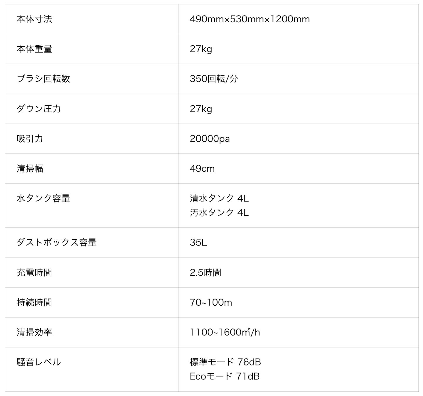 27kgのダウン圧力、350回転/分のブラシ、20000Paの吸引力と、強力な清掃性能を持ち、油汚れ、ほこり、乾燥した汚れなど、さまざまな汚れを洗浄可能。