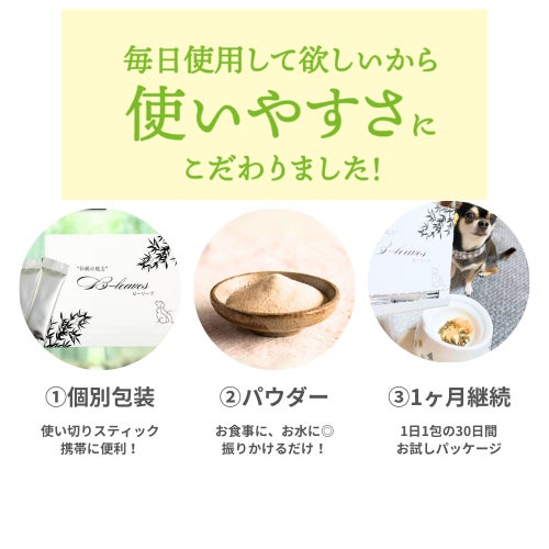 「ビーリーブ」は、古くから健康維持に役立つとされてきたササとヨモギのエキスを配合した、犬猫用の健康サポートパウダーです。