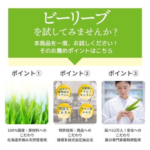 「ビーリーブス」は、ササとヨモギのエキスを主成分としており、ペットの体内環境を整え、自然な免疫力をサポートすることを目指しています。これらの植物は古くから抗酸化作用や抗菌作用があることで知られており、「ビーリーブス」はこれらの特性を最大限に活かすように設計されています。