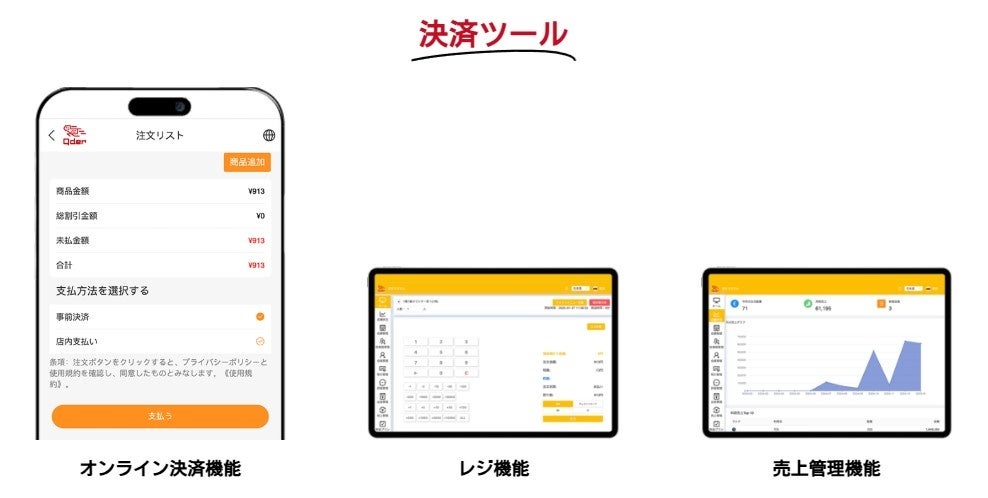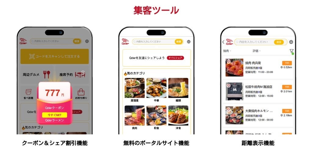 こうした状況を受け、「Qder」は 業務効率化・売上UP ・集客力UPを同時に実現する新たなソリューションとして開発されました。特に、ご来店満足度を維持しながら売上を伸ばす という観点に重点を置き、飲食店経営を支援する機能を多数搭載しています。