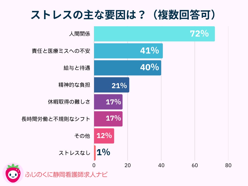約7割を超える看護師が「人間関係」を最大のストレス要因として挙げており、これには上司・同僚との関係や患者・家族への対応における難しさが含まれます。