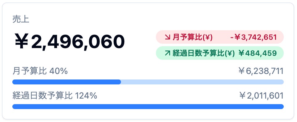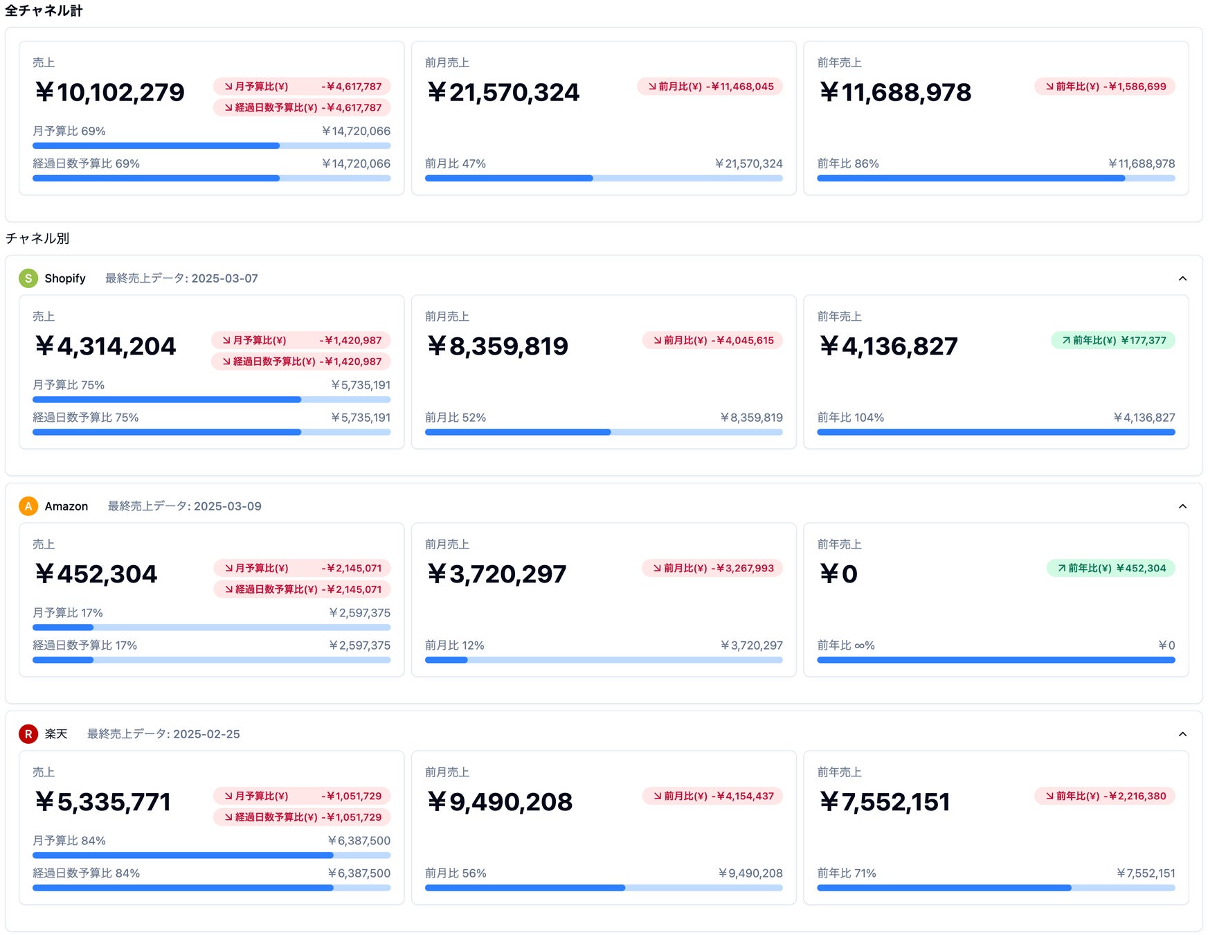 また、ありそうでなかった「予算比」機能を実装。売上予算(目標)を月次・週次・日次で登録できるようにすることで、EC全体および各チャネルの数字の進捗を一目で確認できるようにしています。