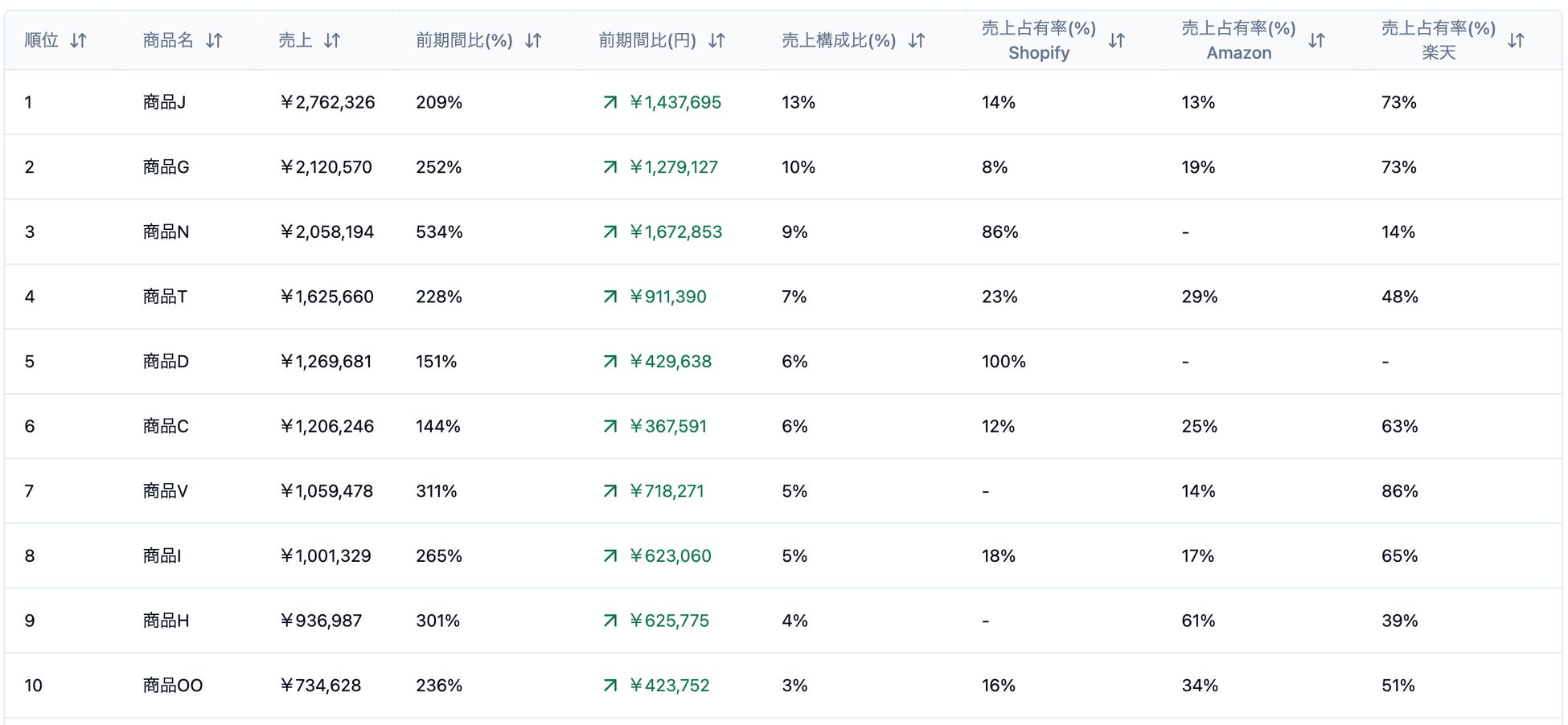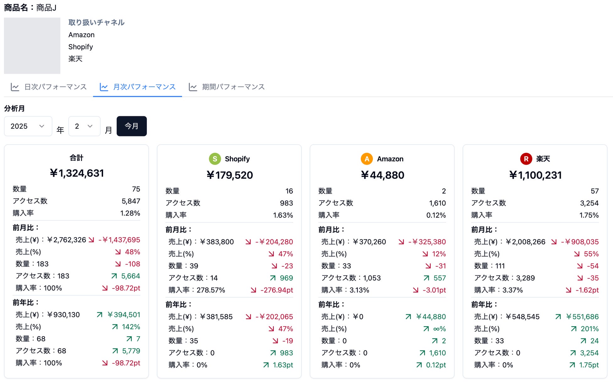 全ての商品に対して、個別のレポートを用意。各チャネルでの売上、販売数量、商品ページへのアクセス数、購入率(コンバージョンレート)といった主要KPIを表示。全てのKPIに対して、デフォルトで前月比・前年比を表示させ、売上の変動要因を明らかにします。