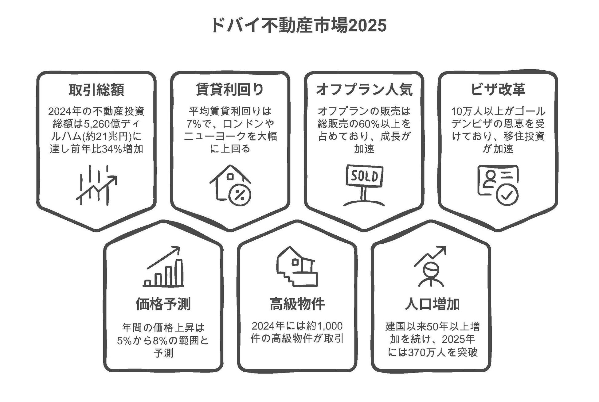 ドバイの不動産市場は、近年の経済成長と投資誘致の加速により、 2024年の不動産投資総額が前年比34%増で過去最高の5,620億ディルハム(約21兆円) を記録しました。年間観光客数は1,870万人 に達し、住居用物件の平均年間利回りは7%台を維持し、国際的な資産分散先として世界的な注目を集めている。