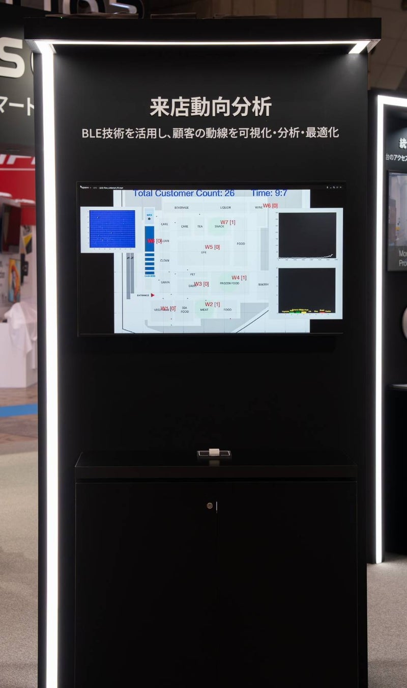サイズや機能の異なる製品を取り揃え、リアルタイムの価格変更、省エネ設計、高い視認性といった最新技術を搭載したESLに加え、ESLタグのボタンを押すだけで在庫を確認し、その場で発注できる機能なども展示。