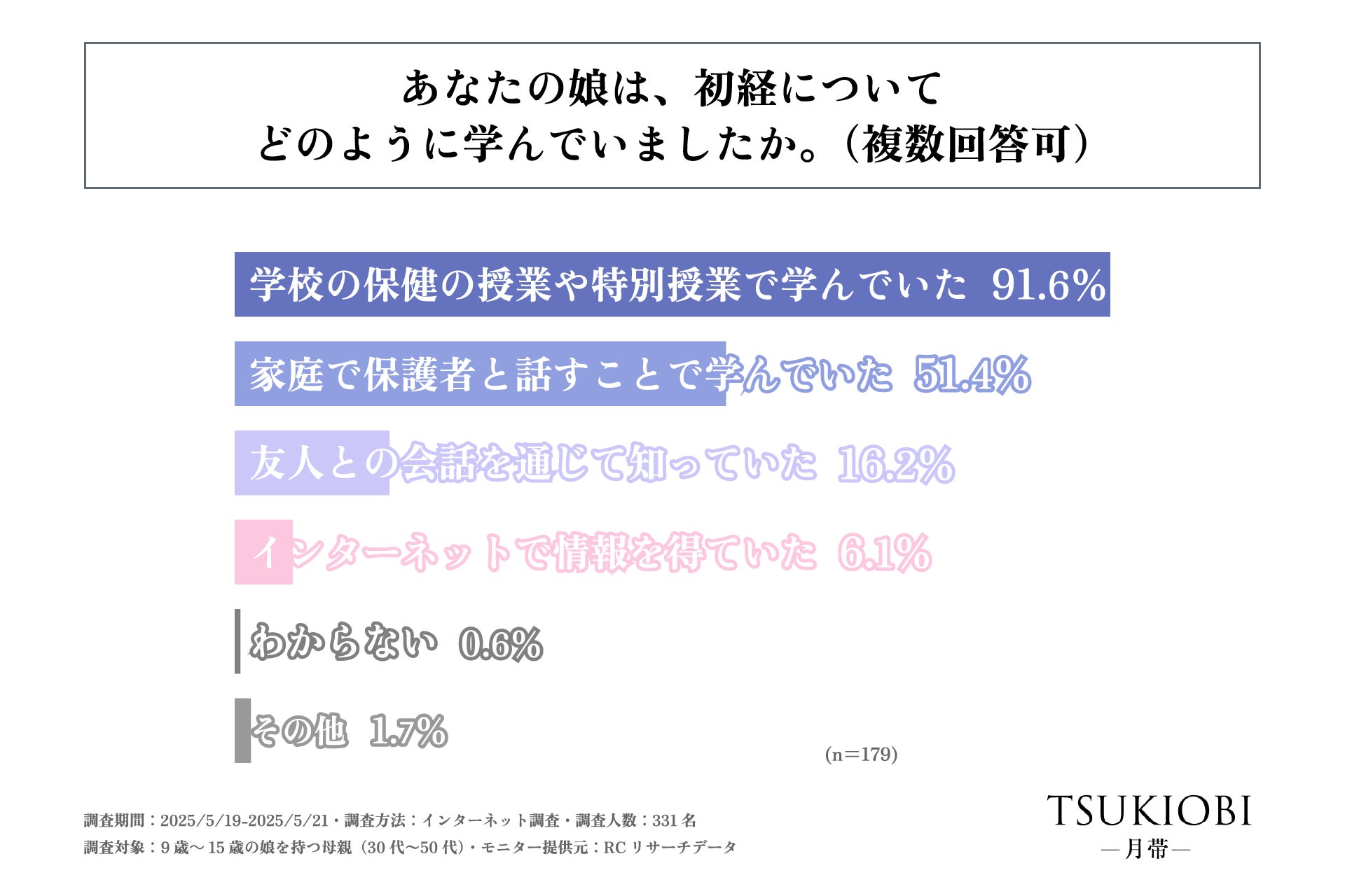 次に、娘が初経を迎える前に生理について学んでいたと回答された方に「あなたの娘は、初経についてどのように学んでいたか」を尋ねる設問への回答では、1位が「学校の保健の授業や特別授業で学んでいた」で91.6%、2位が「家庭で保護者と話すことで学んでいた」で51.4%、3位が「友人との会話を通じて知っていた」で16.2%という結果になりました。この結果から、初経については主に、「学校の保健の授業や特別授業」や「家庭で保護者と話すこと」で学んでいるということが判明しました。