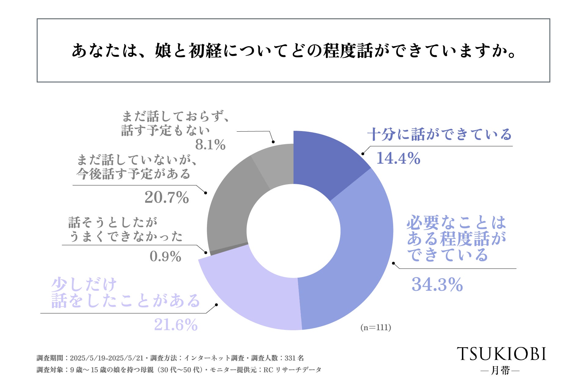 調査の最後、初経を迎えていない(初経を迎えたかわからない)9歳~15歳の娘を持つ30代〜50代の母親を対象に「娘と初経についてどの程度話ができているか」を尋ねる設問への回答では、1位が「必要なことはある程度話ができている」で34.3%、2位が「少しだけ話をしたことがある」で21.6%、3位が「まだ話していないが、今後話す予定がある」で20.7%、4位が「十分に話ができている」で14.4%という結果になりました。1位と2位、4位の回答を合計すると回答率約70%となり、この結果から9歳~15歳の娘を持つ30代〜50代の母親の約7割が、娘と初経について少なからず話しているということが明らかになりました。