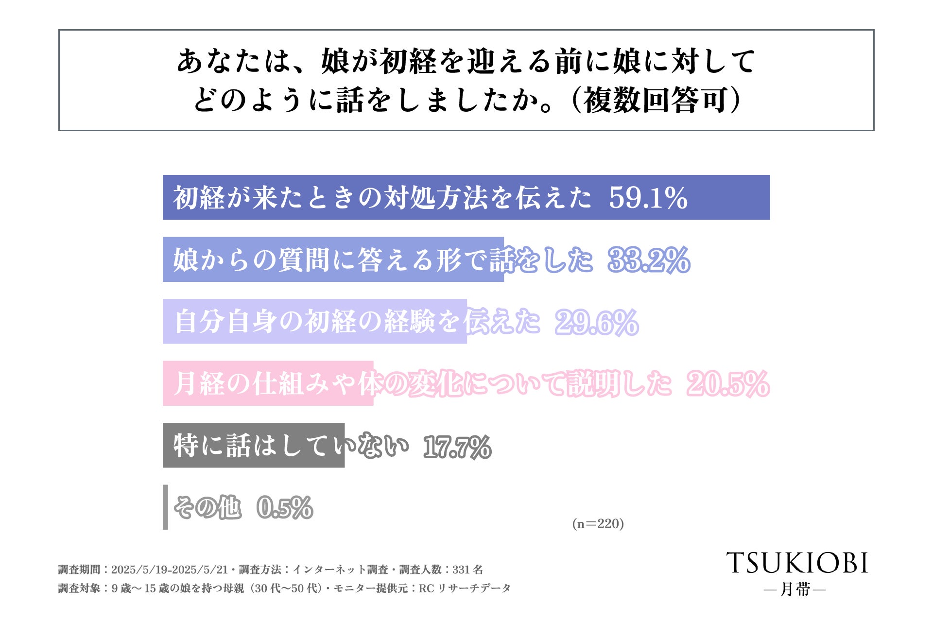 また、初経を迎えた9歳~15歳の娘を持つ30代〜50代の母親を対象に「娘が初経を迎える前に、娘に対してどのように話をしたか」を尋ねる設問への回答では、1位が「初経が来たときの対処方法を伝えた」で59.1%、2位が「娘からの質問に答える形で話をした」で33.2%、3位が「自分自身の初経の経験を伝えた」で29.6%という結果になりました。この結果から、初経を迎える前に娘に対して話したこととしては、「生理が来たときの対処方法」が最も多いことが明らかになりました。
