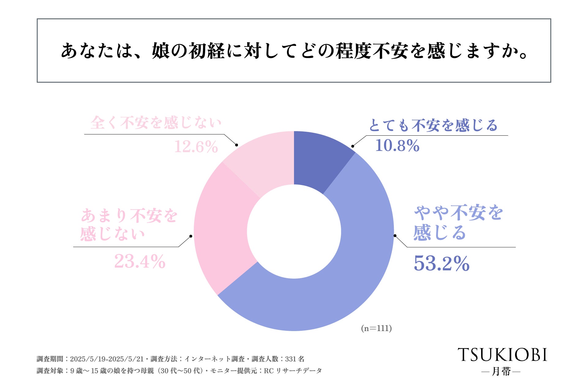 次に、初経を迎えていない(初経を迎えたかわからない)9歳~15歳の娘を持つ30代〜50代の母親を対象に「娘の初経に対してどの程度不安を感じるか」を尋ねる設問への回答では、1位が「やや不安を感じる」で53.2%、2位が「あまり不安を感じない」で23.4%、3位が「全く不安を感じない」で12.6%、4位が「とても不安を感じる」で10.8%という結果になりました。1位と4位の回答を合計すると、回答率60%を超える形になり、この結果から、9歳~15歳の娘を持つ30代〜50代の母親の6割以上が、娘の初経に対して少なからず不安を感じているということがわかりました。