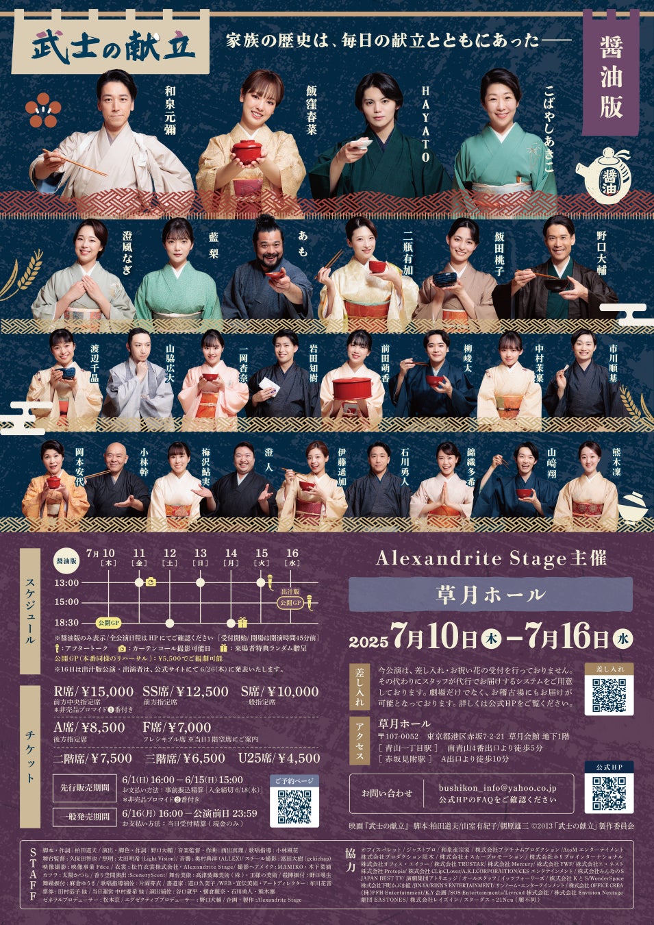Alexandrite Stage Produce最新作、ミュージカル版『武士の献立』が、7月10日から7月16日まで東京・草月ホール、8月8日から8月10日まで石川・能登演劇堂で上演される事が発表された。