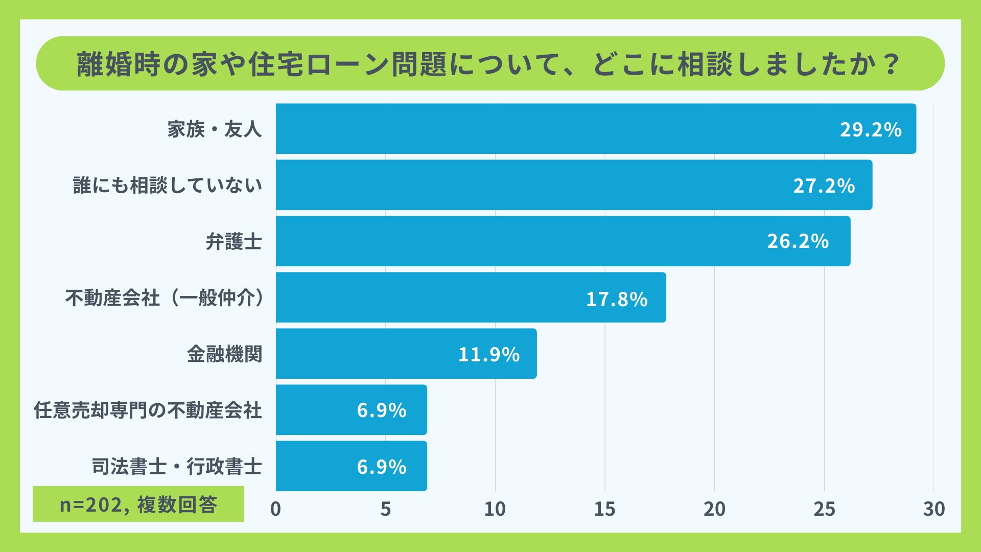 法律面で離婚問題を扱う弁護士への相談が26.2%という結果も出ていますが、実際には不動産売却そのものに詳しいとは限らないケースも見受けられました。