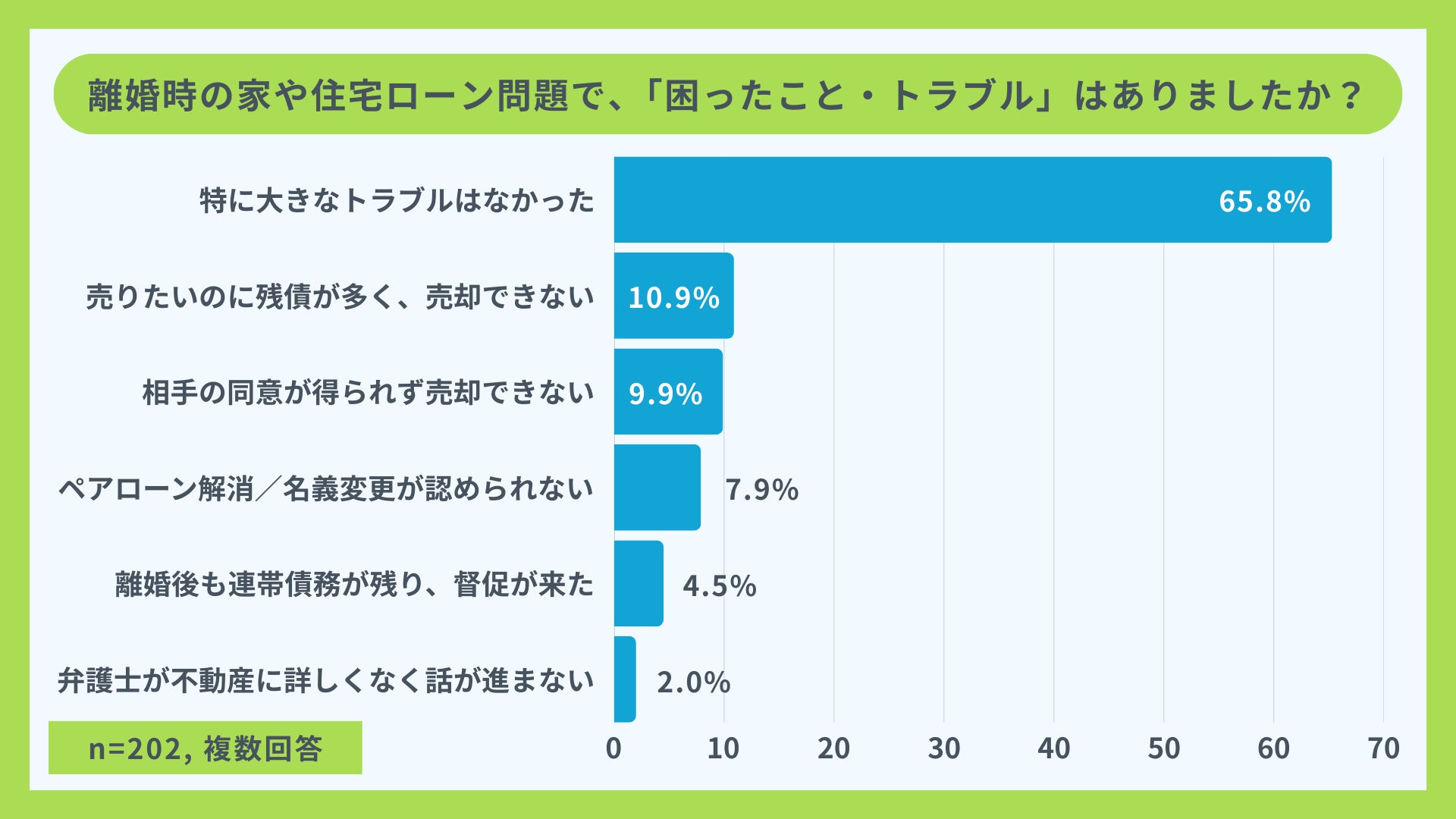 3. 「トラブル経験あり」が35%、「売りたくても残債が多く売れない」「相手が同意せず売れない」「離婚後も連帯債務が残る」など