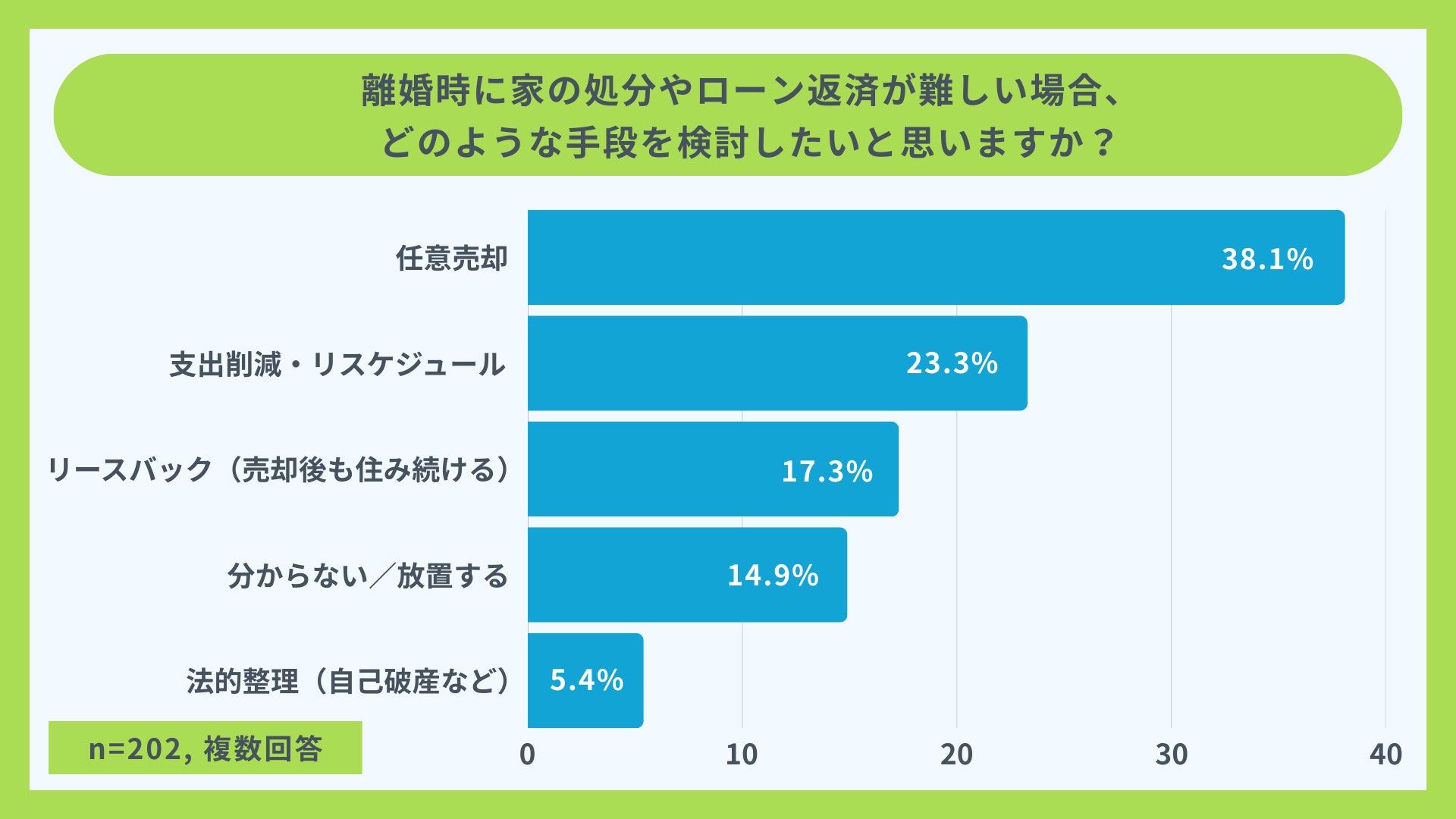離婚によって家を維持するのが厳しくなった場合、約4割が「任意売却」を視野に入れる一方、「具体的にわからないまま放置」してしまうケースが15%近くあることがわかりました。