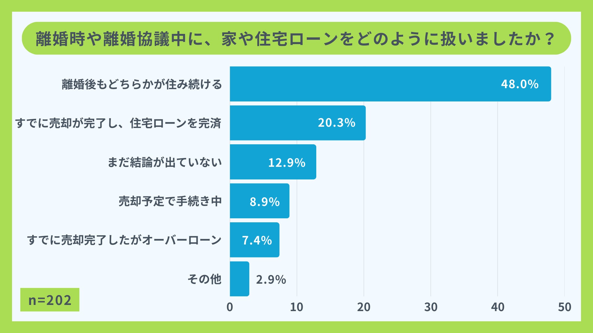離婚後の家の扱いは「住み続ける」が48%で最多。一方、「売却したがローンが残った」「まだ未定」のケースも2割超存在し、住宅ローン問題の複雑さが浮き彫りに。