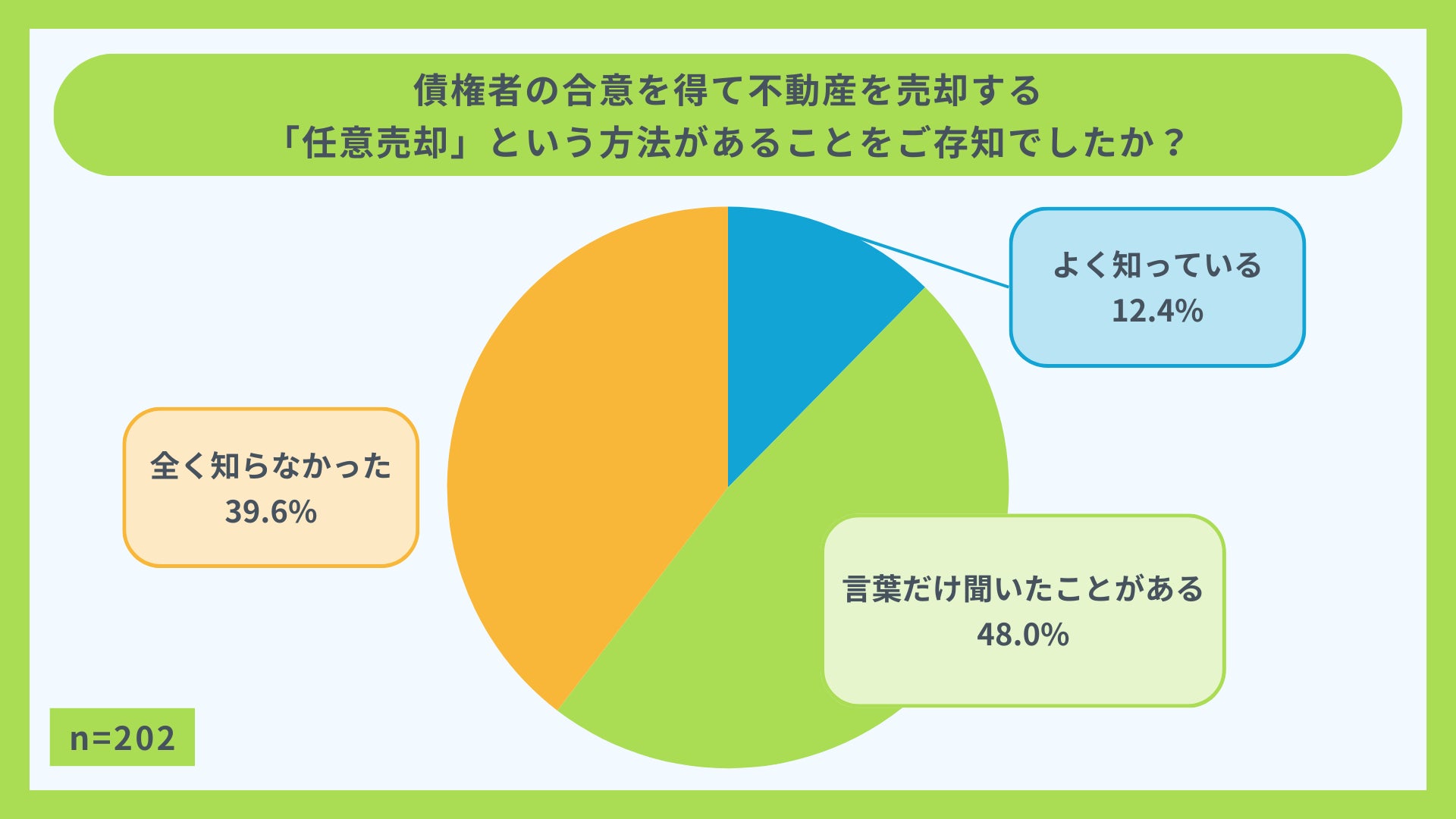 「任意売却」を詳しく知っている方は12%、「全く知らない」が39.6%。離婚後に家を手放す場合でも、競売だけではなく「オーバーローンでも売却できる方法」があると認識している方は依然として少ない。
