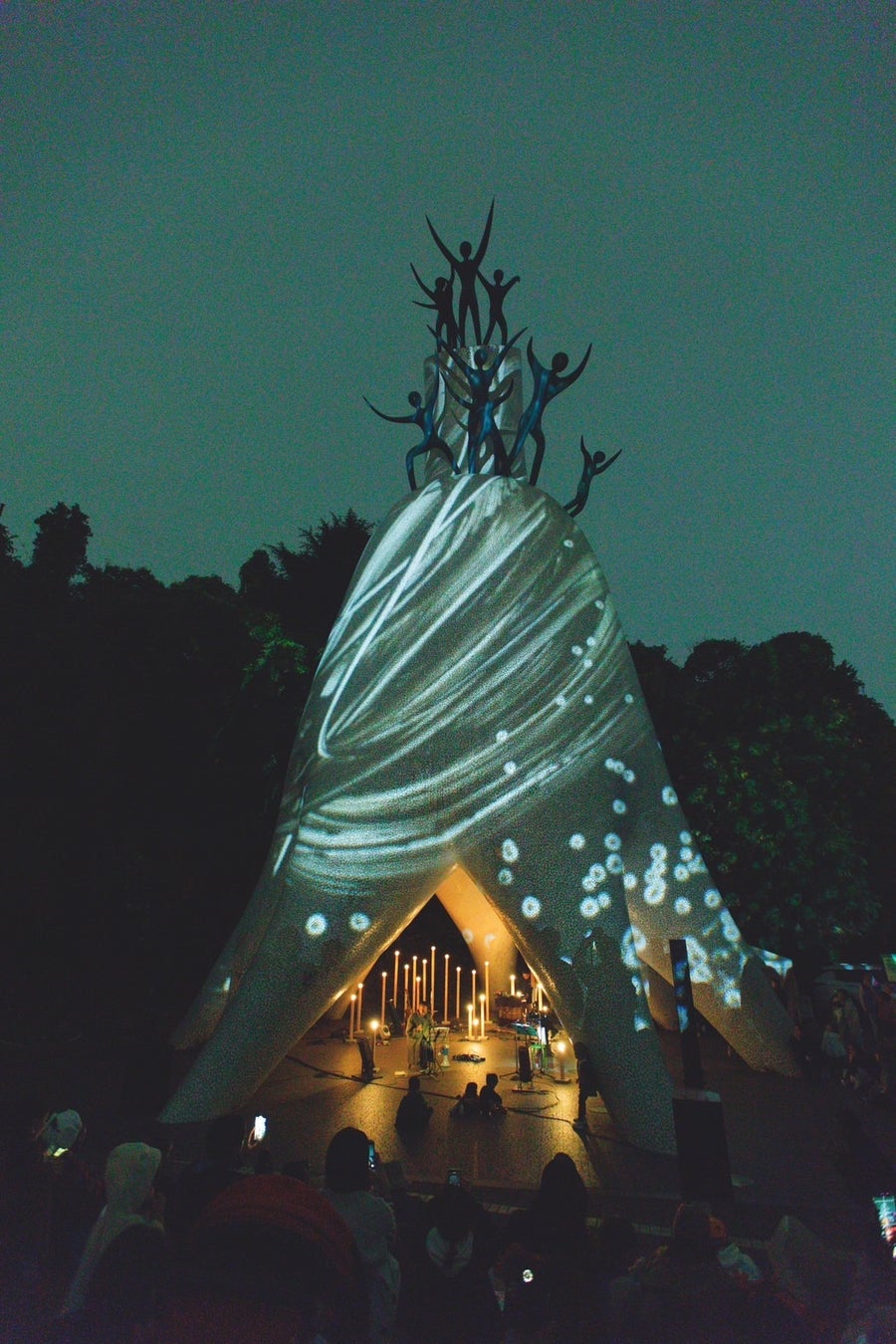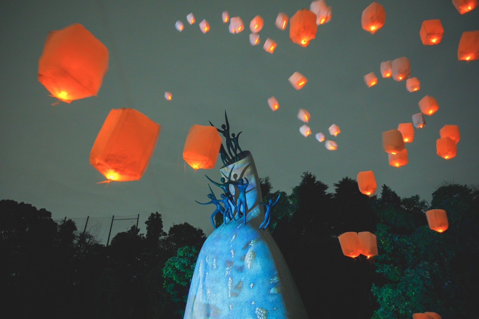 イベントは、会場へ続く森の入り口からすでに始まっています。音響スペシャリスト「WHITELIGHT」によるサウンドスケープが、生田緑地の風や木々のさざめきと調和しながら響き渡ると、まるで森が呼吸をし、目覚めていくかのような感覚に包まれます。暗闇のトンネルを抜けた先には、ひときわ強く輝く《母の塔》。非日常へと誘う旅の始まりです。