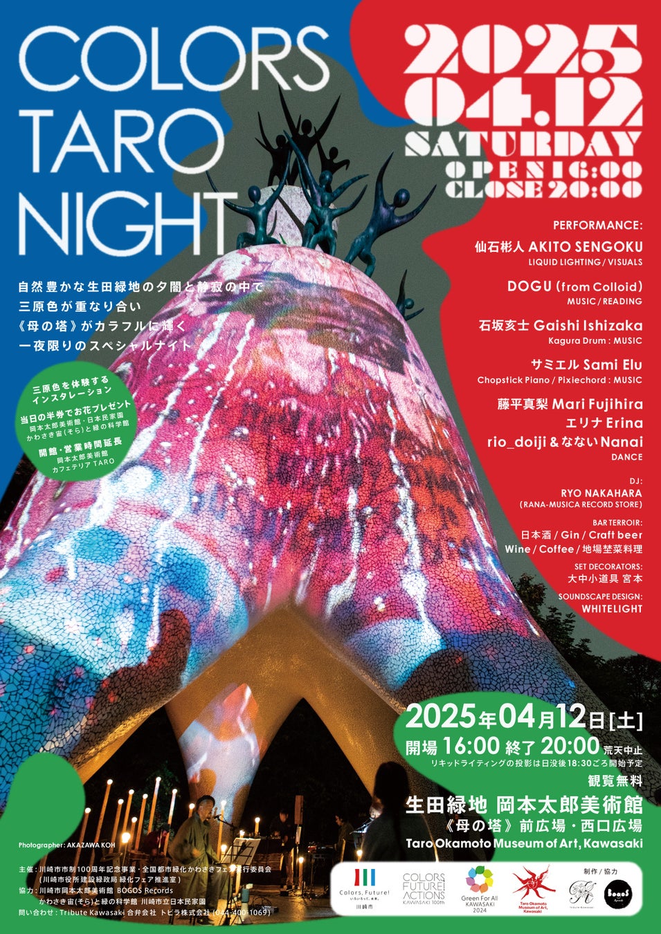 全国都市緑化かわさきフェアの締めくくりとして、「Colors TARO Night」は、ただのイベントではなく、訪れた人の心に刻まれる"体験"を提供します。光と影が織りなす幻想的なアート、夜の森が語りかける静寂、自然とアートの融合が生み出す特別な時間̶̶それは、この緑地の持つ本来の魅力を再発見する瞬間でもあります。
