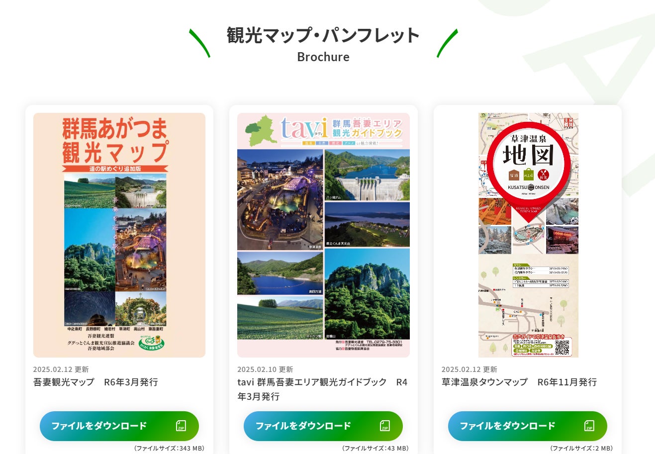 吾妻地域の観光に役立つパンフレットやマップなどのファイルをダウンロードできます。