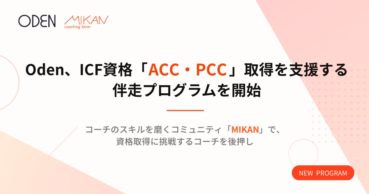 株式会社Oden(本社:東京都渋谷区、代表取締役:会川智華)は、コーチ育成コミュニティ「MIKAN」において、ICF(国際コーチング連盟)認定資格「ACC/PCC」の取得を目指す方向けの伴走型サポートプログラム「ACC・PCC取得サポートプラン」を新たに開始しました。
