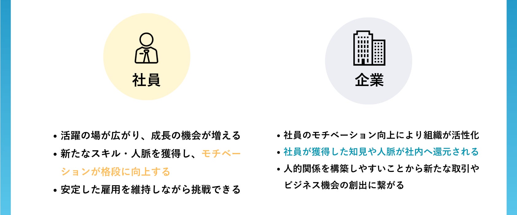 他の複業プラットフォームとは異なり、「越境社員ドットコム」は企業に勤める正社員を対象とし、法人(人事部)を通じて越境案件の提供をサポートしております。