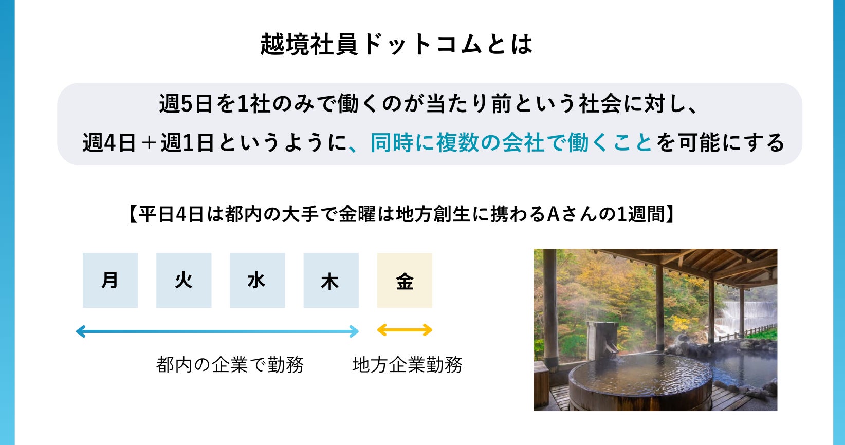 「越境社員ドットコム」は、これまで週5日を1社のみで働くのが当たり前という社会に対し、週4日+週1日というように、同時に複数の会社で働くことが当たり前になる社会を提唱しております。