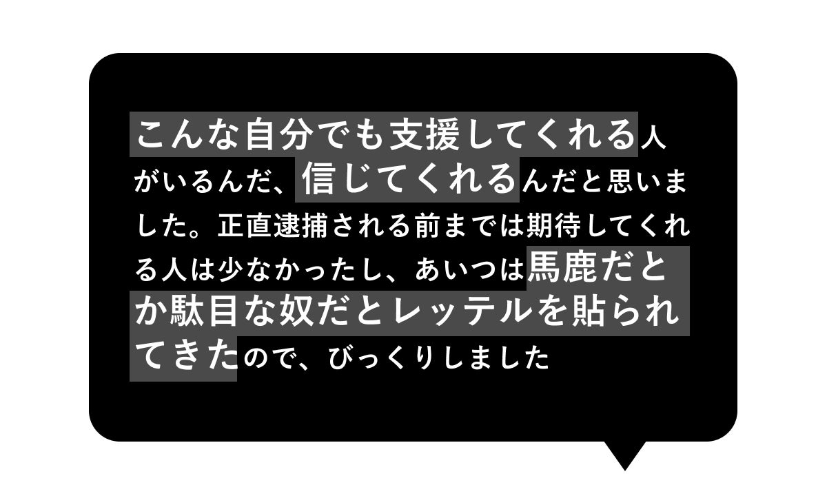 現状を知れば知るほど、彼らが夢や目標を捨ててひっそりと生きていかなければいけないとは、私たちには思えませんでした。自分のしたことを受け止めて、今度は人を助けたり、社会を良くする仕事をする人になれると信じたい。いい環境や出会いがあれば、彼・彼女たちの未来は絶対に変わります。