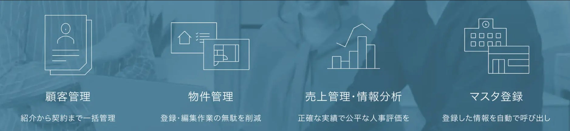 賃貸仲介業のノウハウとテクノロジーを融合させた賃貸仲介業向けのオールインワンシステムです。