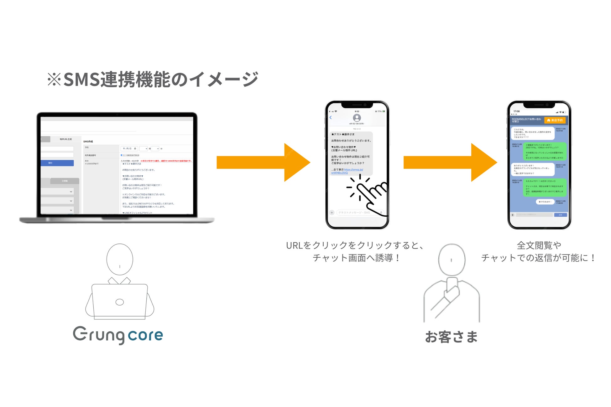 賃貸仲介業の業務効率化・インサイドセールス導入など業界に特化したシステム「グラングコア」に待望のSMS(ショートメール)連携機能が追加され、お客様との連絡がよりスムーズになり来店率の向上に期待。