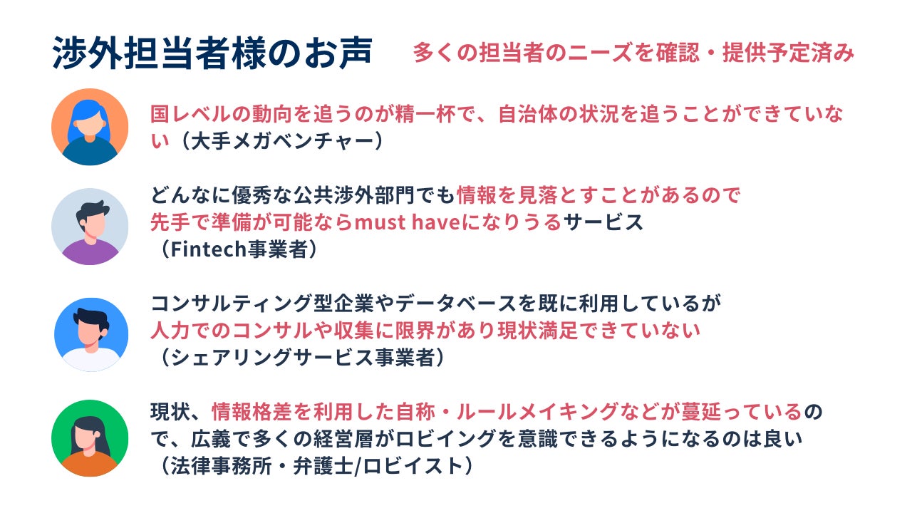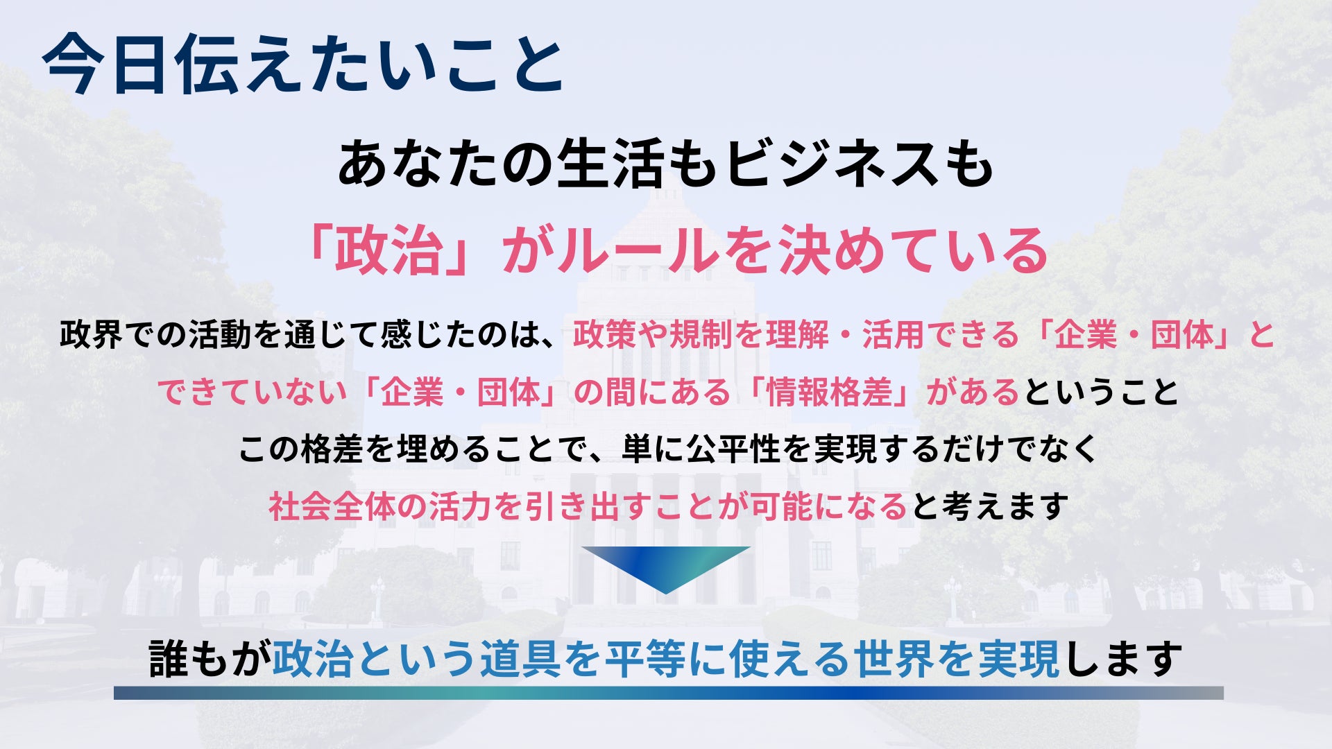 「政策という“見えづらいリソース”を、すべての企業が使いこなせるようにしたい」との想いが語られ、LobbyAIのビジョンが共有されました。