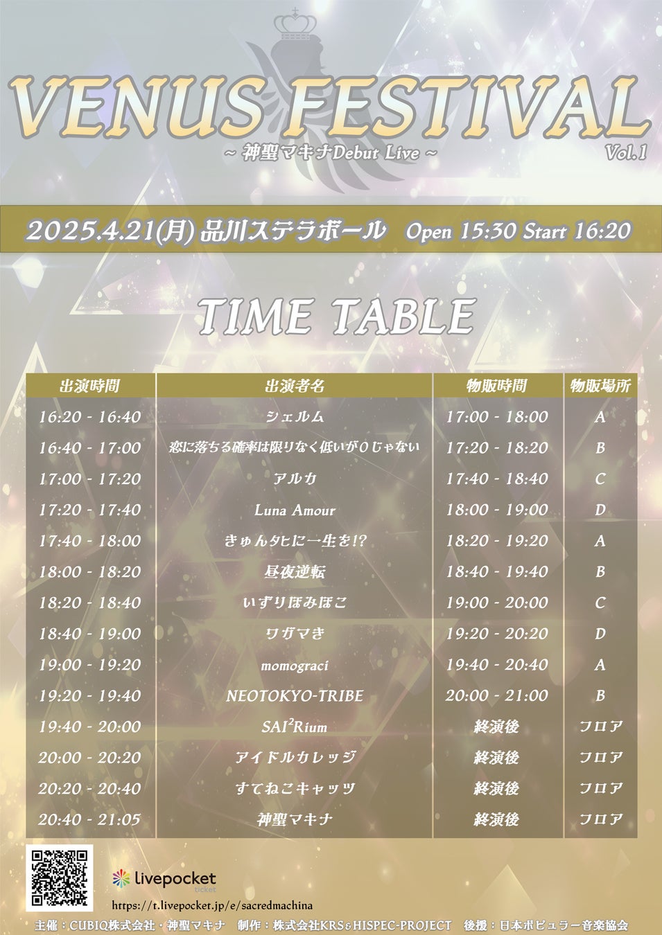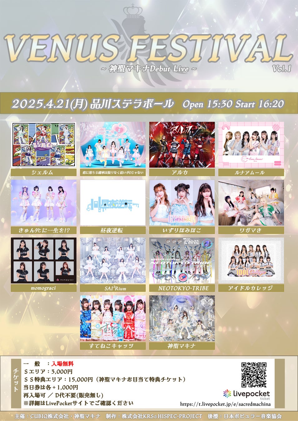 CUBIQ株式会社(本社:東京都豊島区、代表取締役:加登屋敬之)は、アイドルフェス「VENUS FESTIVAL vol.1 ~神聖マキナ Debut Live~ 」を、2025年4月21日(月)品川ステラボールにて開催いたします。