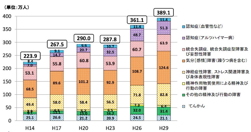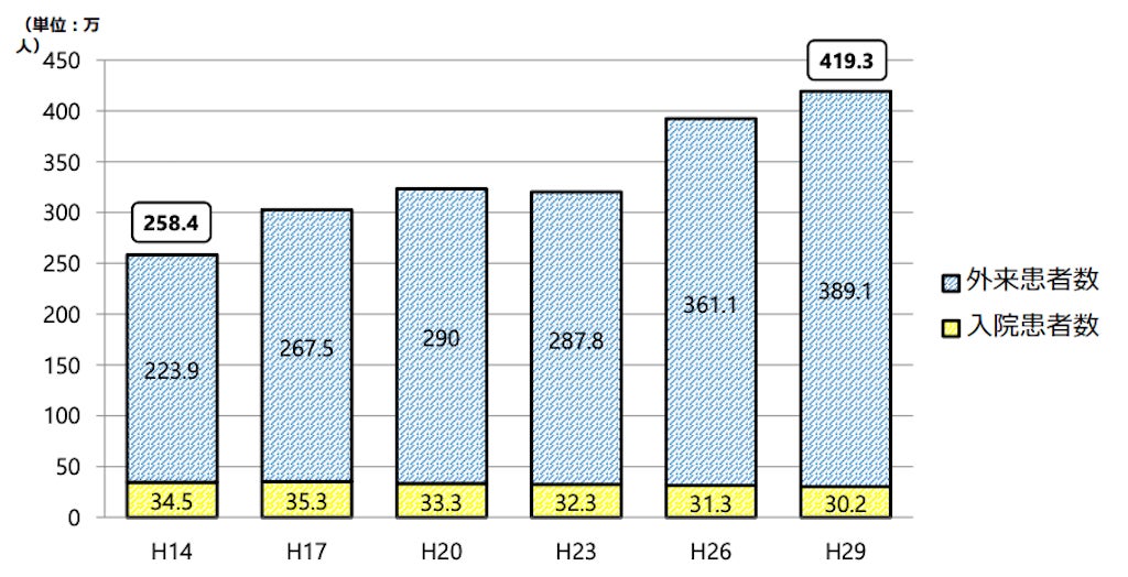 令和4年に公表された『地域で安心して暮らせる精神保健医療福祉体制の実現に向けた検討会|厚生労働省』によると、精神疾患を有する総患者数は約419.3万人と言われています。(入院:約30.2万人、外来:約389.1万人)