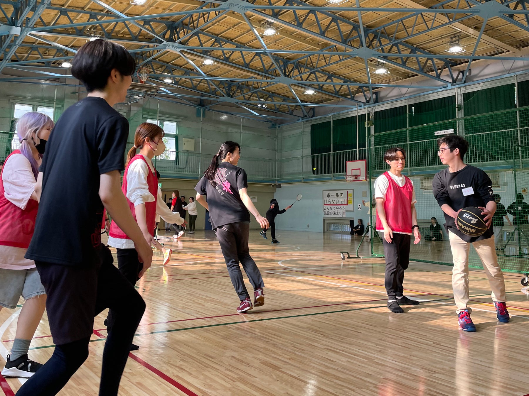 当日は、開始10分前から続々と人が集まり始め、体育館の開放を待ちながら自然と参加者同士の会話も生まれました。体育館が利用可能になった5分前には全員が中へ移動し、各自で着替えを済ませたあと、バドミントンコートや卓球台の設営も参加者たちの手で行われました。