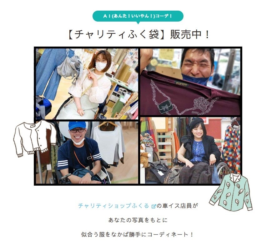 じつは、最新のAIではなく、障害のある店長と店員さんが、その人の雰囲気や好みに合わせ「AI(あんた!いいやん!)」なコーディネートをするという超アナログな「ふく袋」企画。申込コース(3000円、5000円、8000円コース)によって選んだ洋服や雑貨などをお送りします。コーディネートのために、申込の方に事前に、ご本人の写真や、よく来てる服のメーカーや、身体的特徴などを確認し、チャリティショップの商品の中から、店員さんがコーディネートをして発送します。
