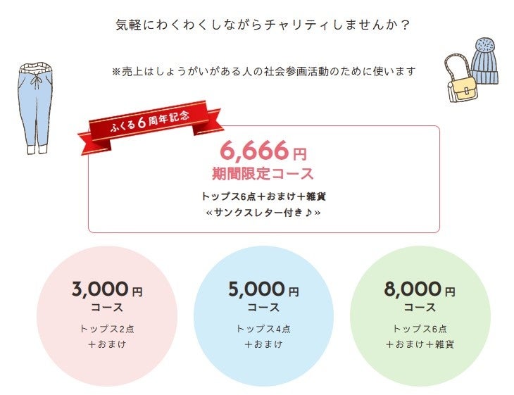 今回は7月末までの期間限定で、6周年にちなみ「6666円」で、トップス6点+おまけ+雑貨+サンクスレターがついたコースを発売。収益は障害のある方の賃金やチャリティ文化醸成や、地域づくりや地域の場づくりのための活動に使われます。