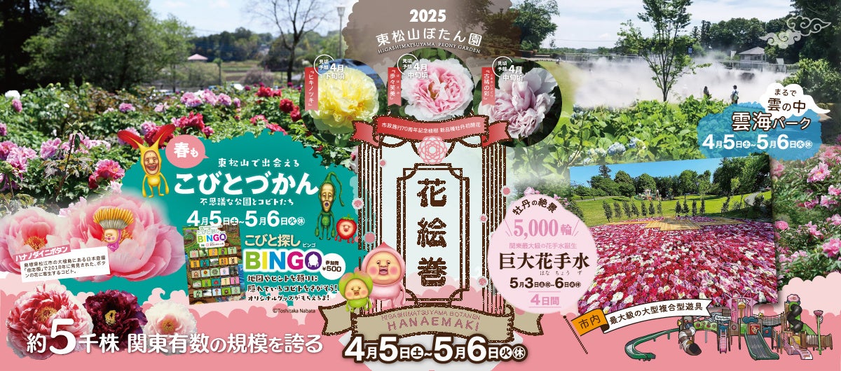 約5千株の牡丹が咲き誇る関東有数の規模の東松山ぼたん園では4月5日から5月6日まで「2025花絵巻」と題し、牡丹のシーズンを盛り上げるイベントを開催いたします。