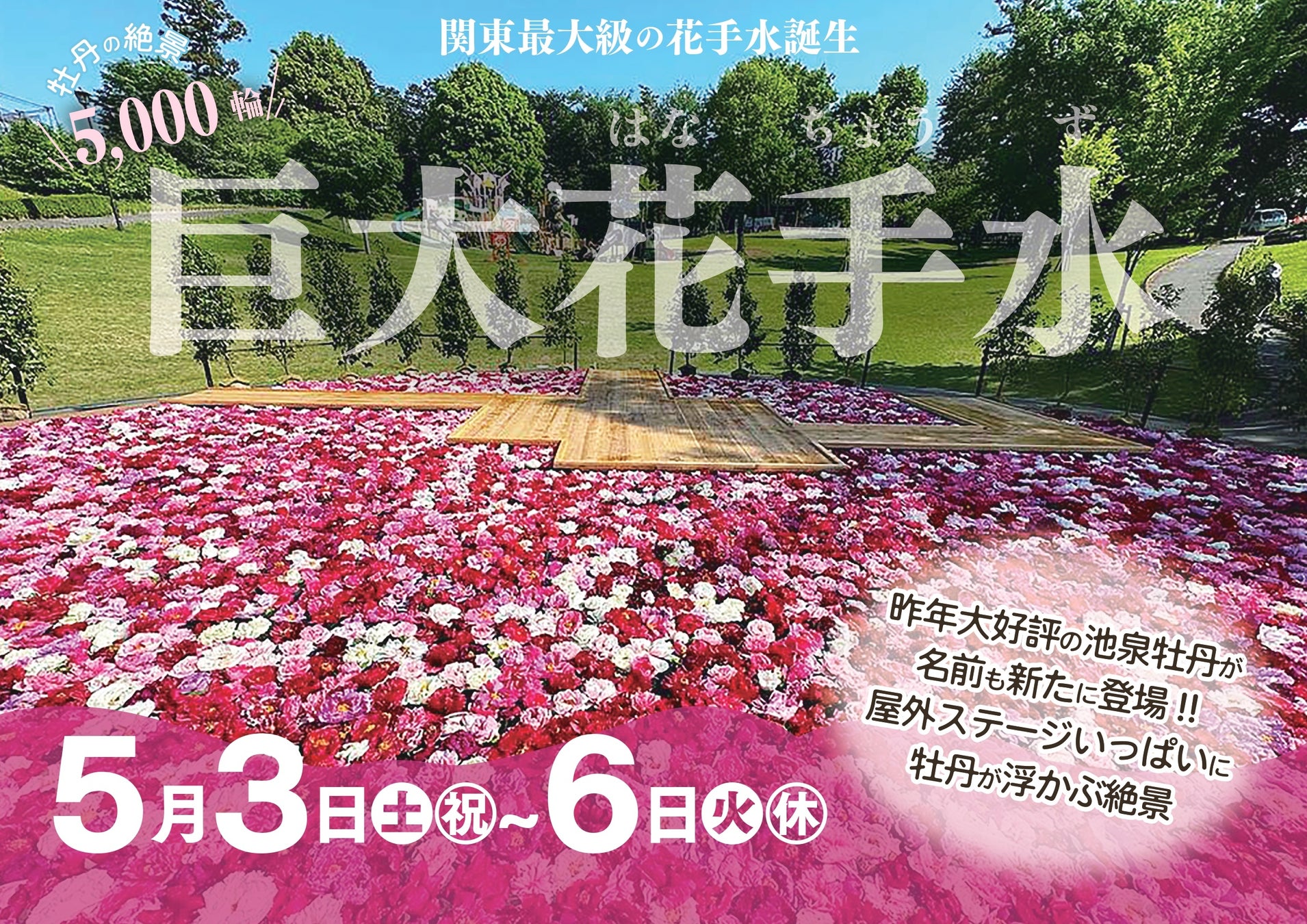 東松山ぼたん園の屋外ステージにGWの4日間限定で巨大花手水が登場します。